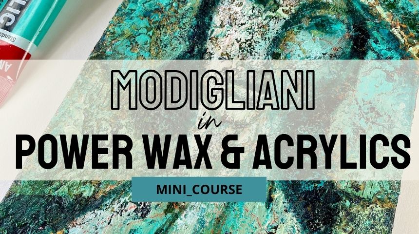 Paint a Modigliani-inspired portrait with elegant, elongated features in turquoise and gold. This mini-class guides you through building textured layers with Powerwax and acrylics, adding gold metallic accents, and creating an expressive portrait with character and glow.